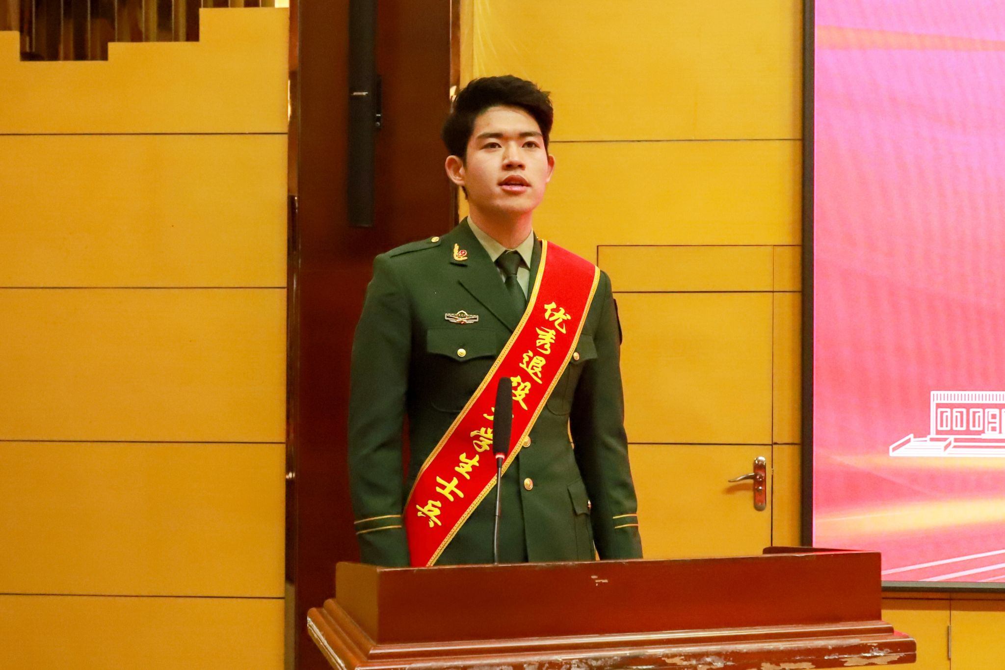 优秀退役大学生士兵代表相博译发言。他分享了自己和金城龙一起学习急救的经历,号召全体退役大学生士兵和雷锋营学员以雷锋精神为指引,用行动诠释担当。