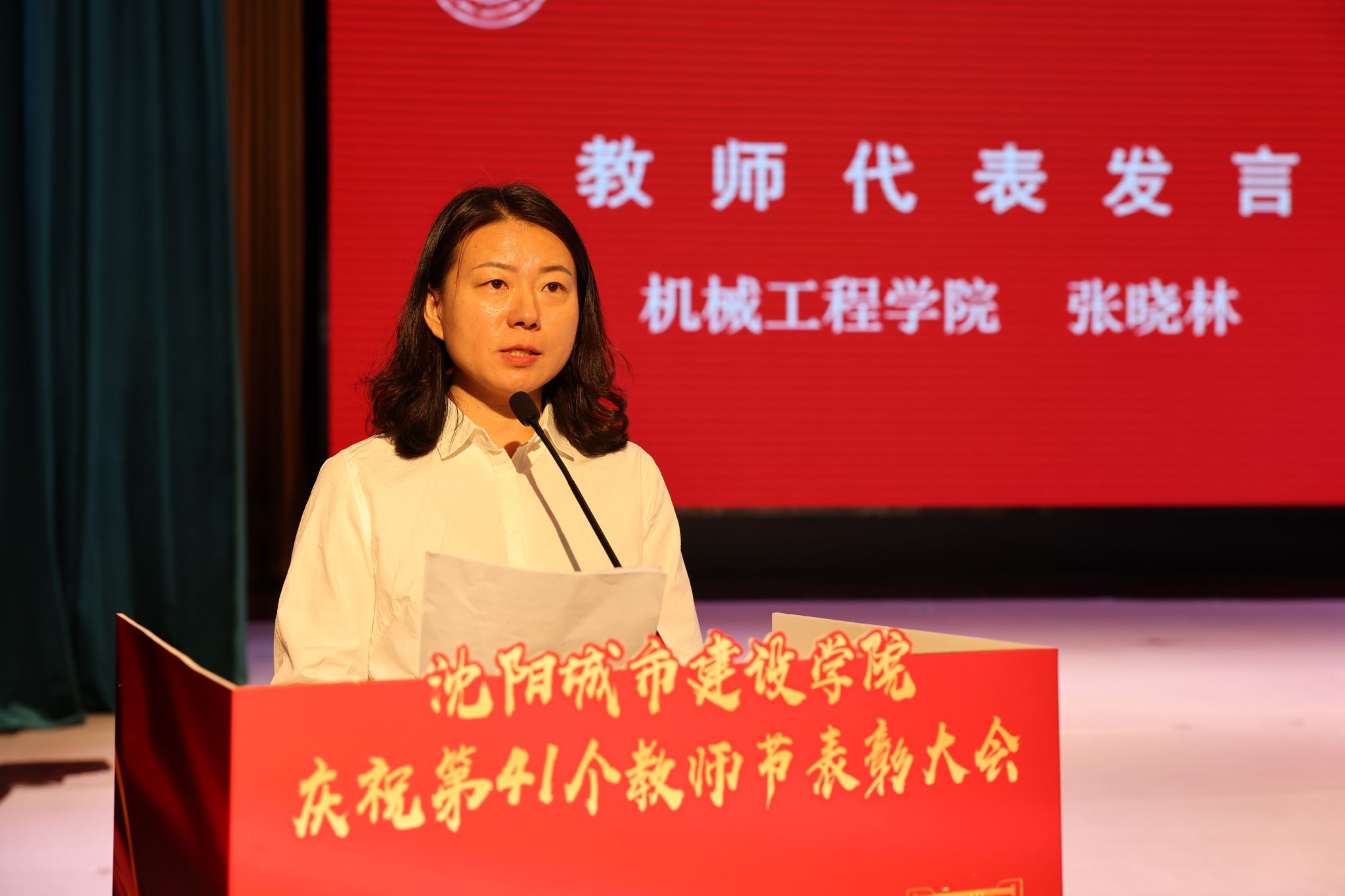 党委书记张晓雁以《躬耕教坛守初心,强校有我担使命》为题致辞。她代表学校领导班子向辛勤耕耘在各个岗位的全体教职员工,致以最热烈的节日祝贺和最诚挚的问候;向受到表彰的先进典型,表示最衷心的祝贺。