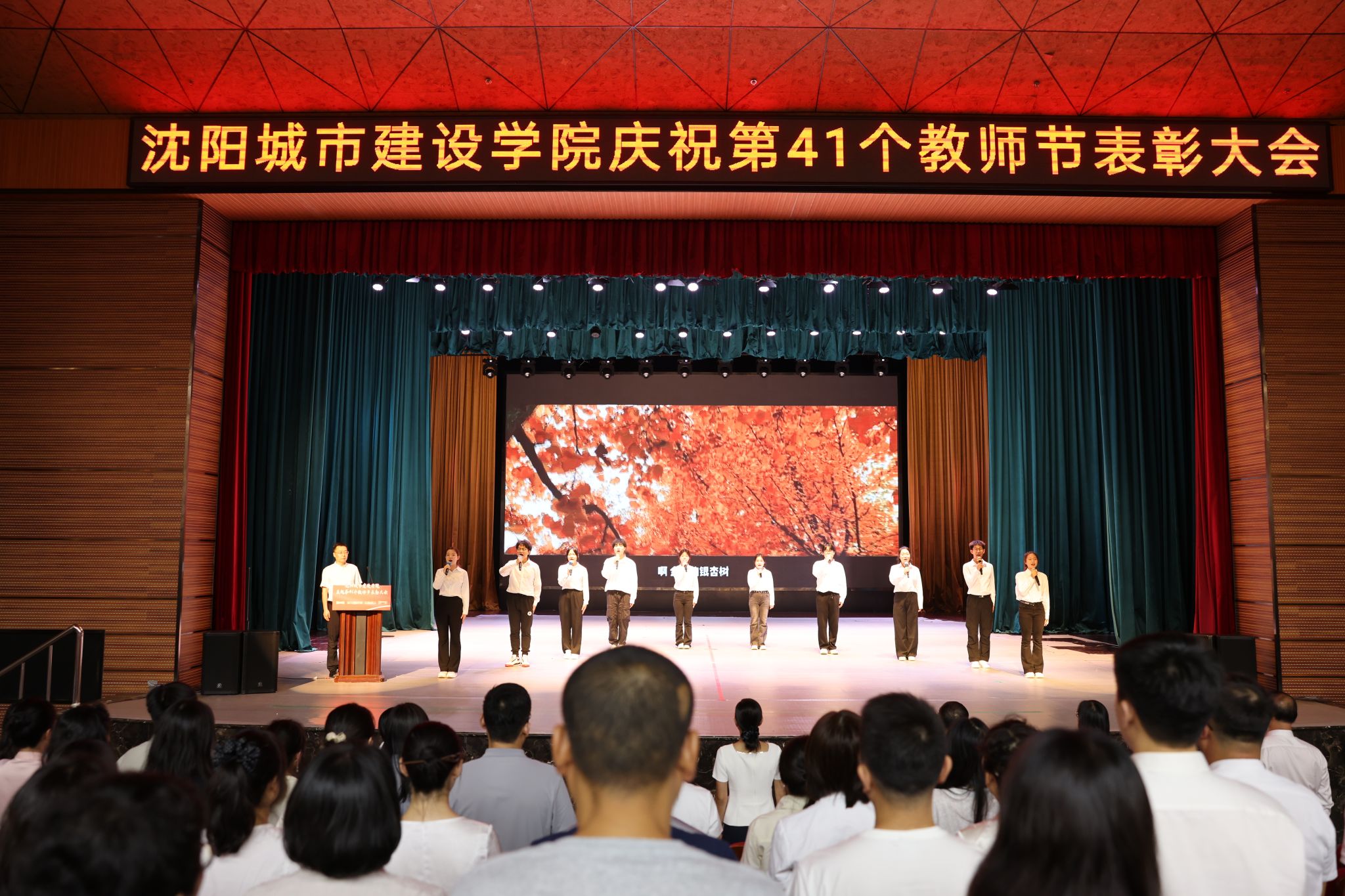 为表彰先进、弘扬师德,凝聚教育发展力量,9月9日,学校在音乐厅举办庆祝第41个教师节表彰大会。学校领导张晓雁、李海燕、张涛、李厚艳、王莞菊、张蕾出席大会,全体教职工参加大会。副校长傅柏权主持大会。