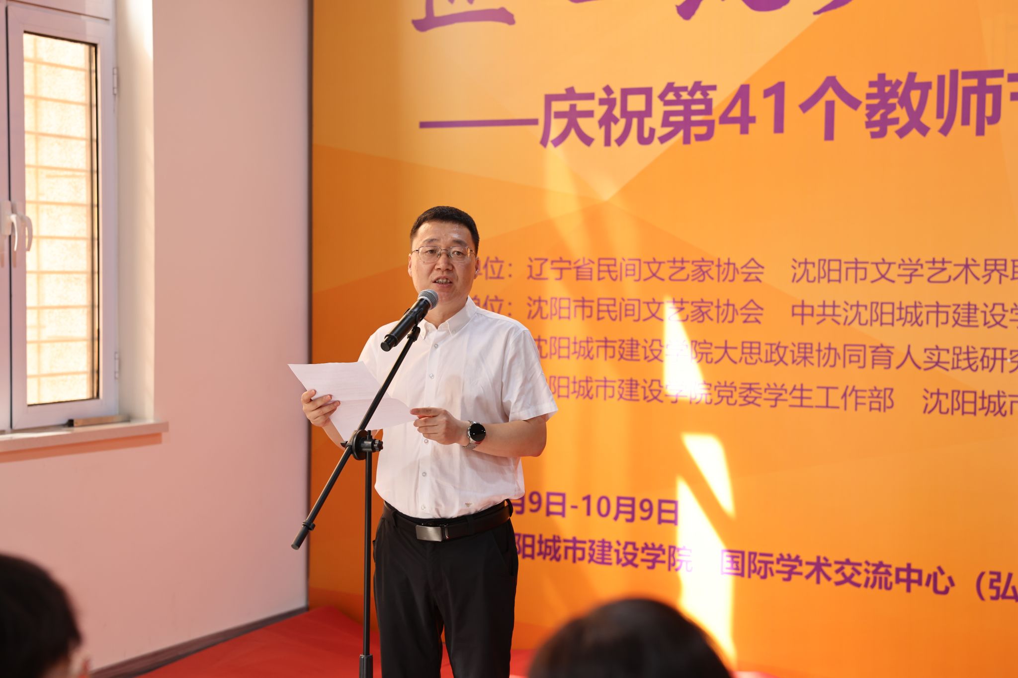林喦致开幕词。他代表辽宁省文联对展览的开幕表示热烈祝贺,向沈阳城市建设学院广大教职员工致以节日的问候。林喦指出,此次辽宁省民协与沈阳城市建设学院以“匠心”为题举办教师节主题活动,是向执着坚守、默默奉献的“匠心”致敬,旨在倡树尊师重教的社会风尚!他希望,通过此次活动进一步加强省文联所属文艺家协会与各高校的融通共建、协同合作,不断构建高校美育教育新合力,推进中华优秀传统文化在高校青年大学生中的传播、传承,激发校园文化创新创造活力,为高校文化育人注入深厚的历史底蕴和时代价值,为青年大学生成长成才提供丰富的精神滋养和道德引领。