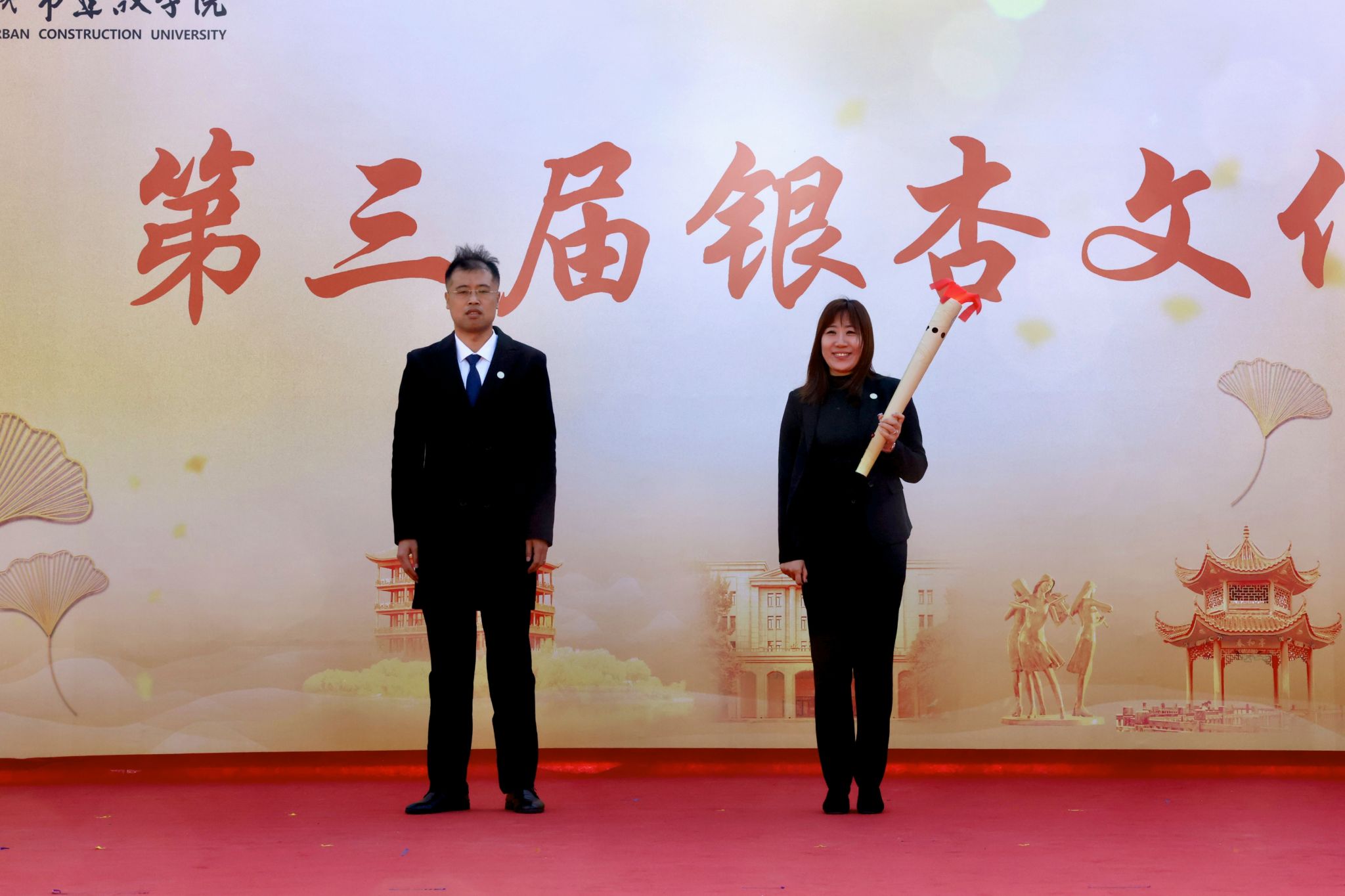 银杏精神,薪火相传。现场进行了银杏火炬交接仪式。市政与环境工程学院党总支书记、副院长于婷从土木工程学院党总支书记、副院长钟建东手中接过火炬。